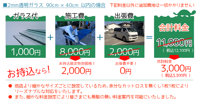 (当店のガラス交換料金は、ガラス代・交換施工費・出張費・副資材費など全てを含んだコミコミ価格で記載しています。)